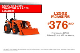 Kubota L2502HST tractor with R4 tires, hydrostatic transmission, four wheel drive, LA526 loader with skid steer style hitch and 66″ bucket with bolt on cutting edge